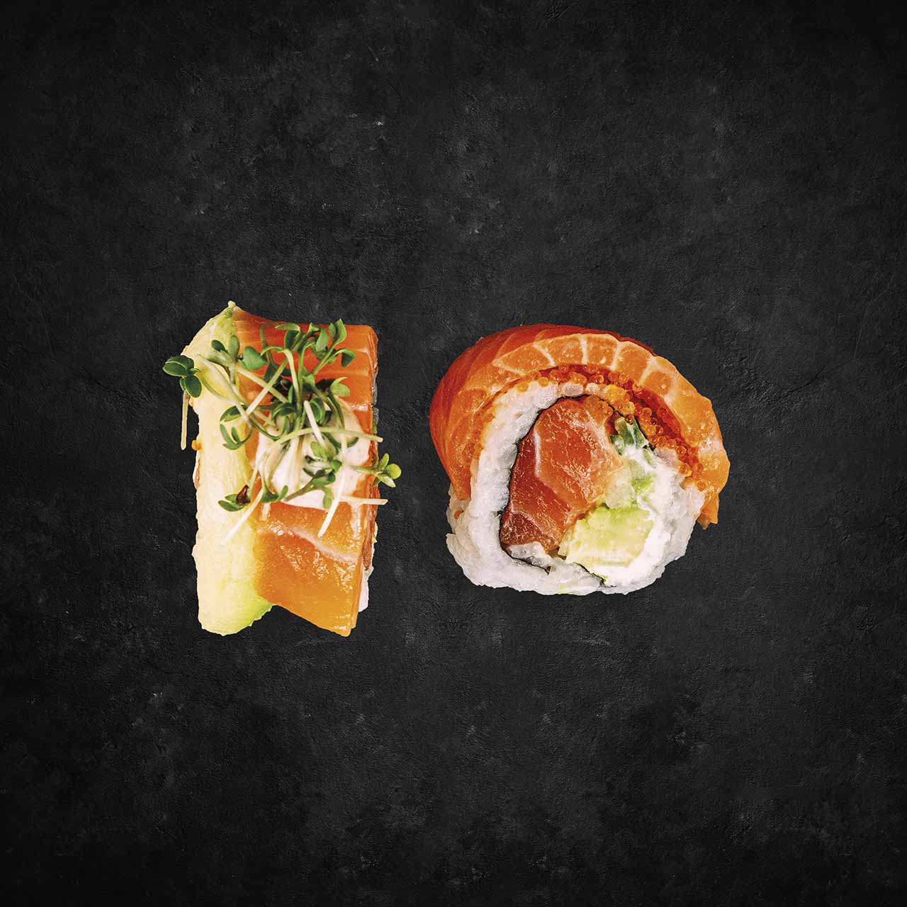 Laks, avocado, agurk, philadelphia, flyvefiskerogn toppet med laks, avocado, persillemayo & karse